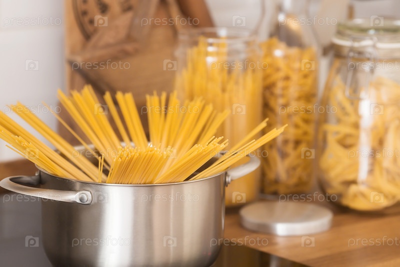 Процесс приготовления домашней итальянской пасты на кухне. Предыстория жизни. Спагетти на сковороде. Горизонтальный