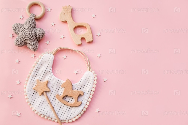 Биб и деревянные игрушки. Набор детских вещей и аксессуаров для девушки на пастельно-розовом фоне. Концепция детского душа. Модный новорожденный. Плоский лед, вид сверху