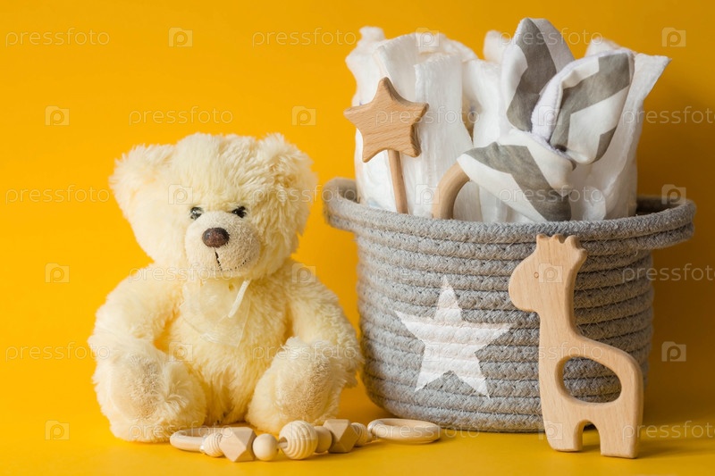 Деревянные игрушки, медведь, стопка подгузников и детские принадлежности на модном желтом фоне. Копируйте пространство для текста