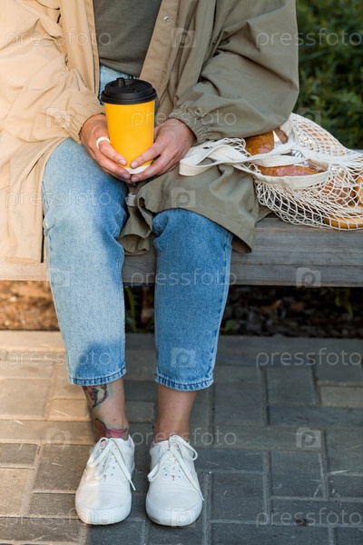 Современная стильная женщина с бумажной чашкой горячего кофе в руках и струнной сумкой со свежим хлебом на скамейке. Концепция уличной еды и экологии. Отказ от пластиковых пакетов