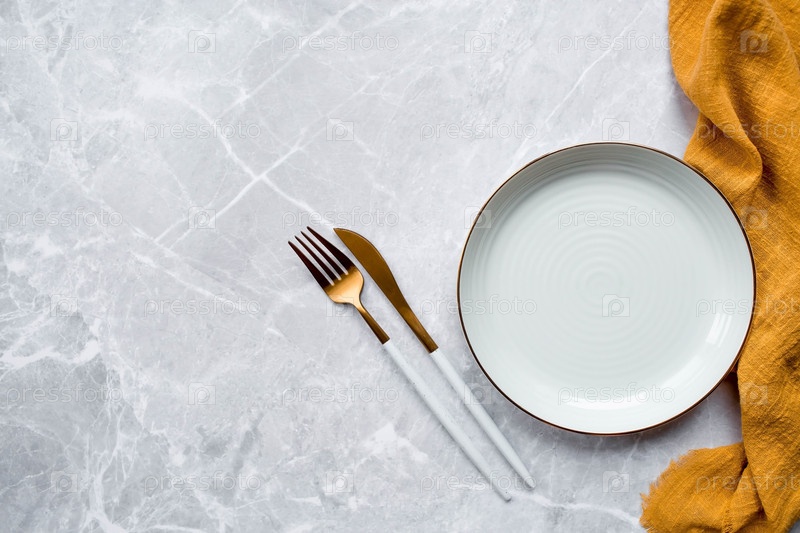 Знамя. Пустая керамическая пластина, вилка, нож и полотенце на фоне серого бетонного стола. Пространство для текста. Концепция меню для кафе и ресторанов