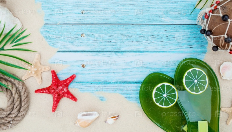 Концепция отдыха на море. Корпуса, соломенная шляпа и песок на бирюзовом деревянном фотофоне. Картинка для летних каникул с пространством для текста. Вид сверху