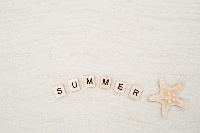Концепция отдыха на курорте. Морские звезды, веревка и надпись «лето» сделаны из деревянных кубиков на песке. Предыстория летних каникул с пространством для текста. Вид сверху