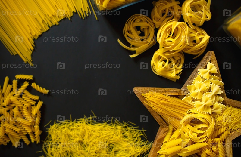 Кулинарный фон с различными видами макаронных изделий (спагетти, фузилли, фарфалл) на черном столе. Форма звезды. Вид сверху. Плоский