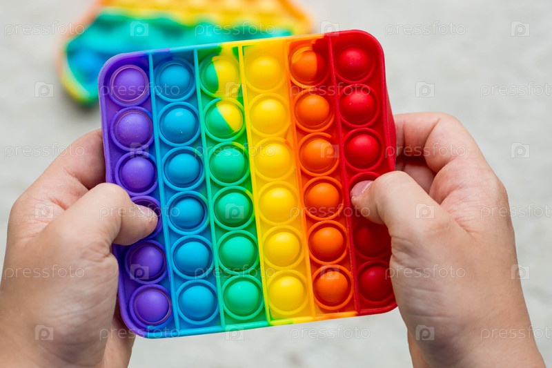 Ребенок с красочной поп-игрой. Антистресс. Снимок крупным планом детских рук, играющих с популярной поп-музыкой Это игрушка