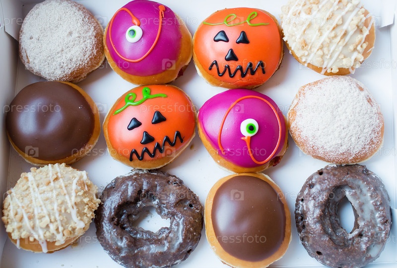 Вкусные, красочные пончики, украшенные к празднику Хэллоуин. Вид сверху