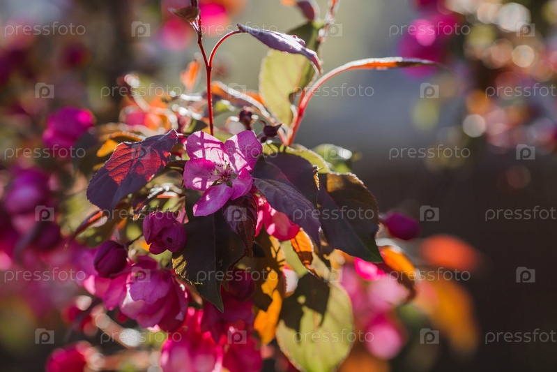 Макрофотография. Розовая декоративная яблоня цветет в прекрасном свете заката. Весна, обои природы. Цветущая яблоня в саду. Цветут розовые цветы на ветвях дерева