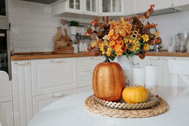 Натюрморт. Желтые, оранжевые цветы в вазе, тыквы и свечи на золотом подносе на белом столе в интерьере домашней кухни. Уютная осенняя концепция