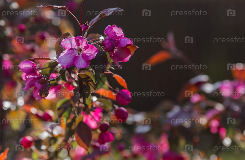 Макрофотография. Розовая декоративная яблоня цветет в прекрасном свете заката. Весна, обои природы. Цветущая яблоня в саду. Цветут розовые цветы на ветвях дерева