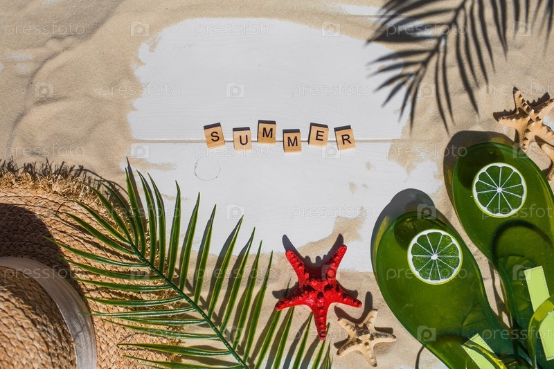 Концепция отдыха на море. Ракушки, звезды, соломенная шляпа, бикини, солнцезащитные очки, лаймовые шлепанцы и маракасы на песке. Предыстория летних каникул с пространством для текста. Вид сверху