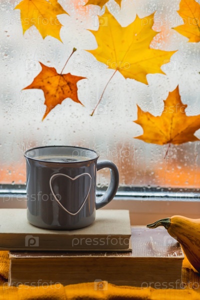 Осенний натюрморт с красивым боке. За окном кленовые листья и капли дождя бегут по стеклу. Чашка горячего чая, книги и вязаное одеяло у окна