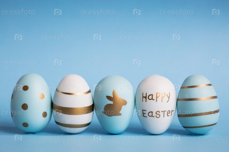 Пасхальные яйца на синем фоне. Основное понимание Пасхи. Пасхальная открытка с пространством для текста