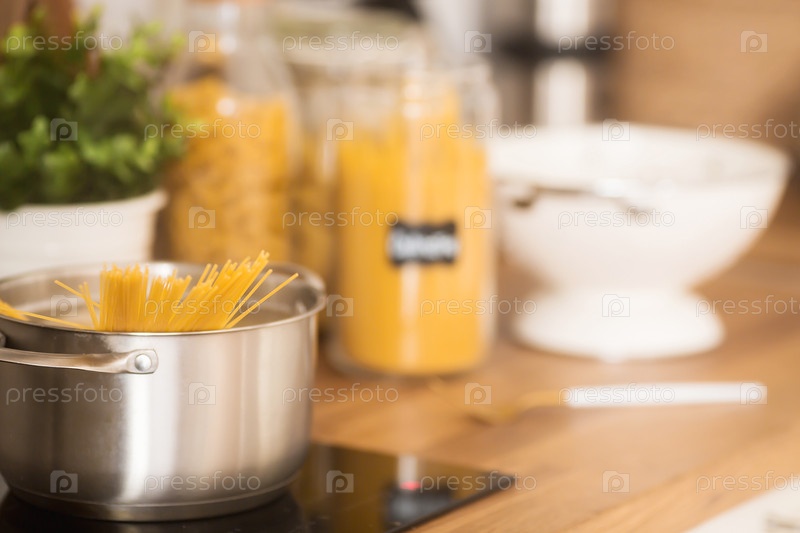 Процесс приготовления домашней итальянской пасты на кухне. Предыстория жизни. Спагетти на сковороде. Горизонтальный