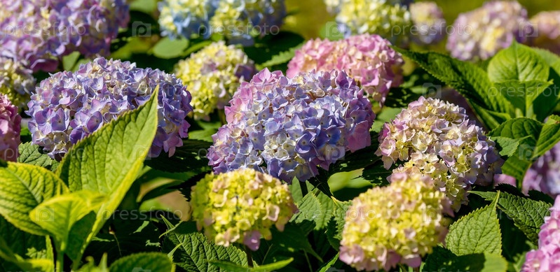 Летнее фото или фон с разноцветными цветами. Красивая природа с цветущим деревом. Красивые здоровые гортензии, цветущие в синих, розовых и фиолетовых оттенках