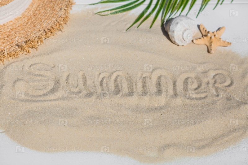 Концепция отдыха на море. Оболочки, соломенная шляпа и слово лето на белом песке. Предыстория летних каникул с пространством для текста. Вид сверху