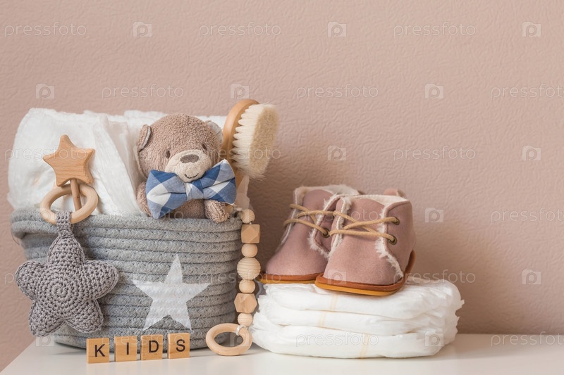 Деревянные игрушки, стопка подгузников и детские принадлежности на сменный стол. Копируйте пространство для текста