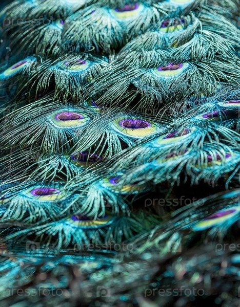 Красивая текстура павлиньих перьев крупным планом. Абстрактный красочный фон птичьего хвоста