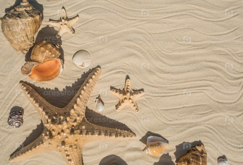 Концепция отдыха на море. Оболочки, звезды, соломенная шляпа на белом песке. Предыстория летних каникул с пространством для текста. Вид сверху