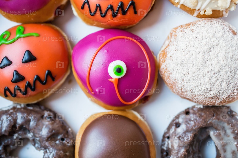 Вкусные, красочные пончики, украшенные к празднику Хэллоуин. Вид сверху