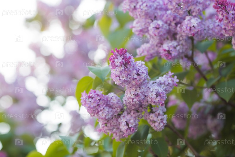 Знамя. Нежный фиолетовый сиреневый цветет в парке. Цветы на закате. Свет от солнца. Близко. Красивый боке на заднем плане