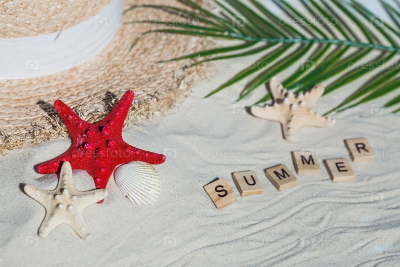 Концепция отдыха на море. Оболочки, звезды, соломенная шляпа на белом песке. Предыстория летних каникул с пространством для текста. Вид сверху