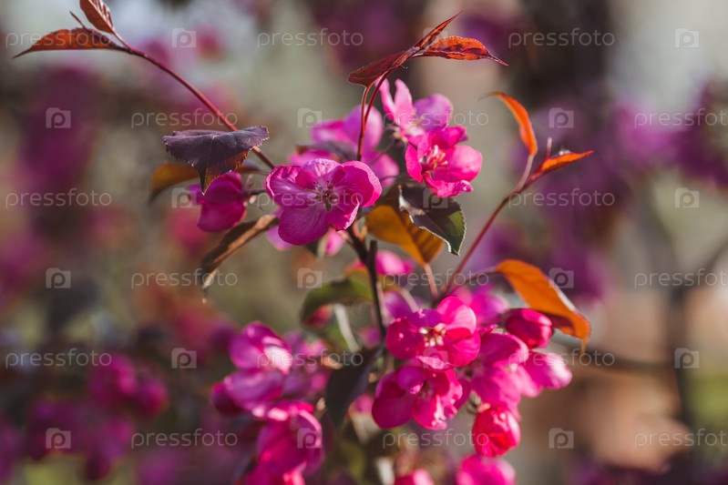 Макрофотография. Розовая декоративная яблоня цветет в прекрасном свете заката. Весна, обои природы. Цветущая яблоня в саду. Цветут розовые цветы на ветвях дерева
