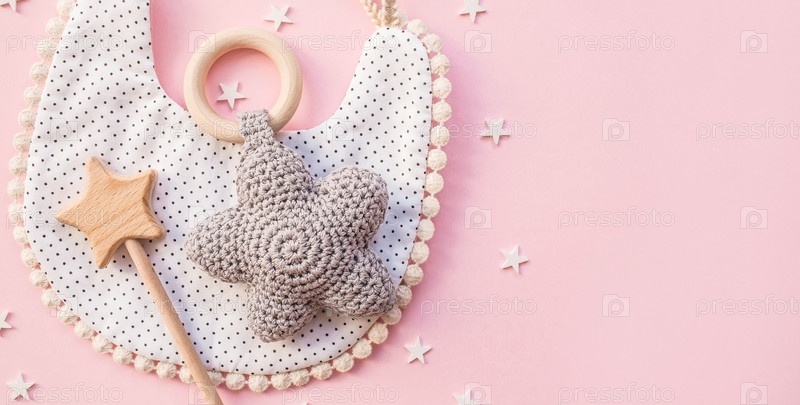 Биб и деревянные игрушки. Набор детских вещей и аксессуаров для девушки на пастельно-розовом фоне. Концепция детского душа. Модный новорожденный. Плоский лед, вид сверху