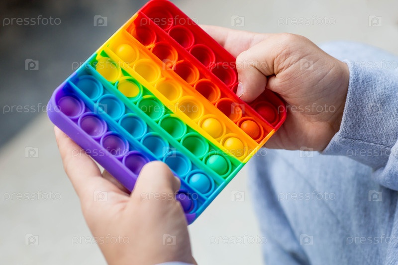 Ребенок с красочной поп-игрой. Антистресс. Снимок крупным планом детских рук, играющих с популярной поп-музыкой Это игрушка