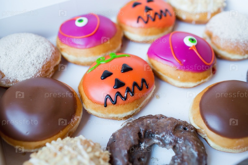 Вкусные, красочные пончики, украшенные к празднику Хэллоуин. Вид сверху