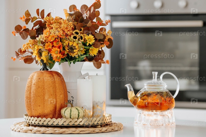 Натюрморт. Желтые, оранжевые цветы в вазе, тыквах, чайнике и чашке чая на белом столе в интерьере домашней кухни. Уютная осенняя концепция