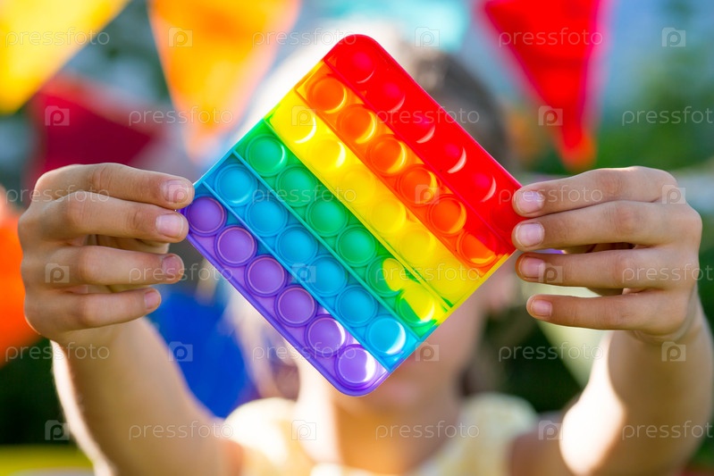 Ребенок с красочной игрой «Поп». Антистресс. Закрытие детских рук популярной поп-музыкой Это игрушка. Аутизм