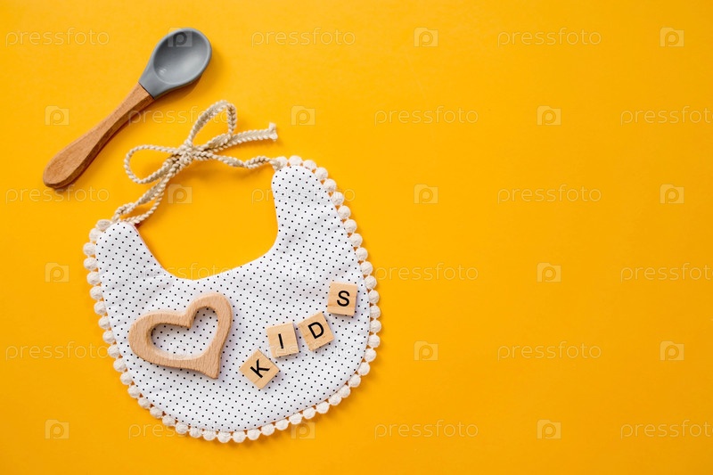 Ватная палочка, силиконовая ложка и слова, которые дети делали из деревянных кубиков на модном желтом фоне, лежали плоскими. Обслуживание детского питания