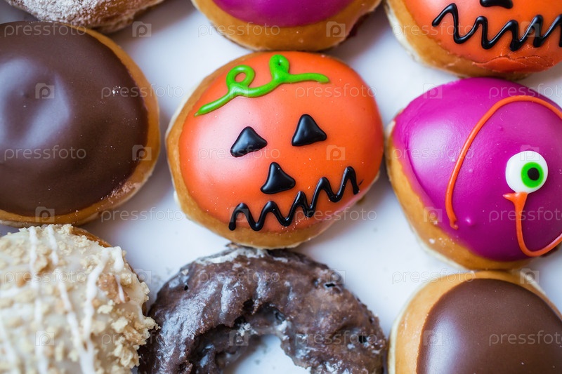Вкусные, красочные пончики, украшенные к празднику Хэллоуин. Вид сверху