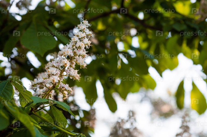 Каштановые ветви и цветы с солнечными лучами на закате. Весной цветущее дерево. Близко
