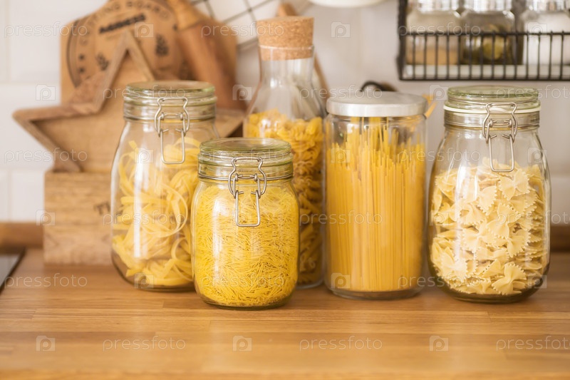 Кулинарное образование. Стеклянные банки с различными видами макаронных изделий (спагетти, фузилли, фарфалл) на кухонном деревянном столе