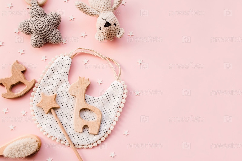 Биб и деревянные игрушки. Набор детских вещей и аксессуаров для девушки на пастельно-розовом фоне. Концепция детского душа. Модный новорожденный. Плоский лед, вид сверху