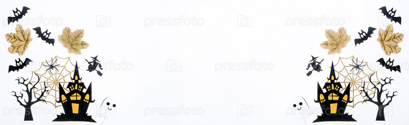 Знамя. Современный фон с летучими мышами, черными и золотыми тыквами, листьями, паутиной, пауками на белом фоне. Хэллоуин с копией для текста. Плоский лед, сверху