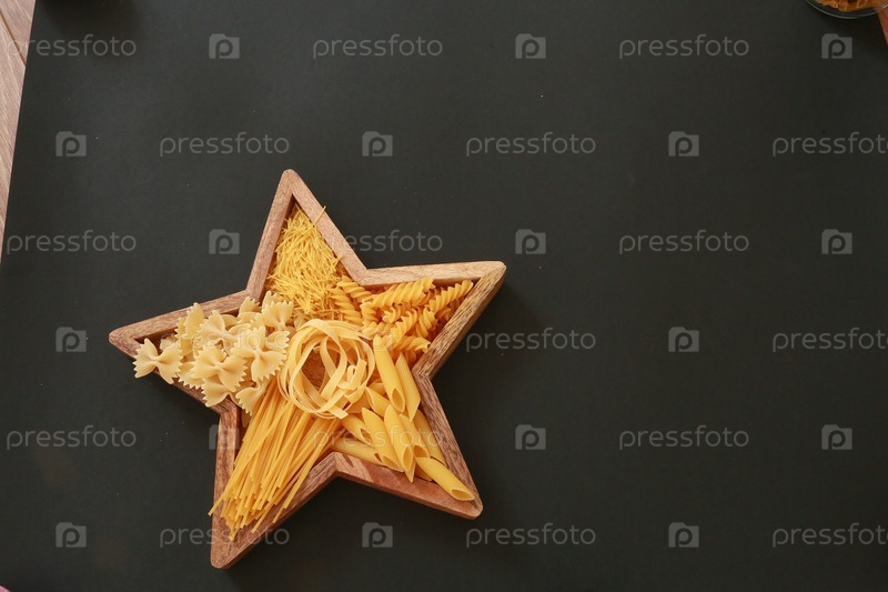 Кулинарный фон с различными видами макаронных изделий (спагетти, фузилли, фарфалл) на черном столе. Форма звезды. Вид сверху. Плоский мир