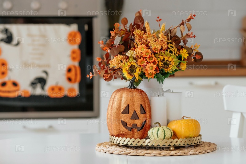 Ваза цветов, тыква и свечи на подносе. На заднем плане - интерьер белой кухни в стиле сканди. Концепция дома и комфорта. Осенний декор к празднику Хэллоуин