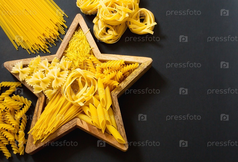 Кулинарный фон с различными видами макаронных изделий (спагетти, фузилли, фарфалл) на черном столе. Форма звезды. Вид сверху. Плоский