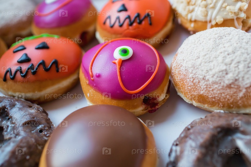 Вкусные, красочные пончики, украшенные к празднику Хэллоуин. Вид сверху