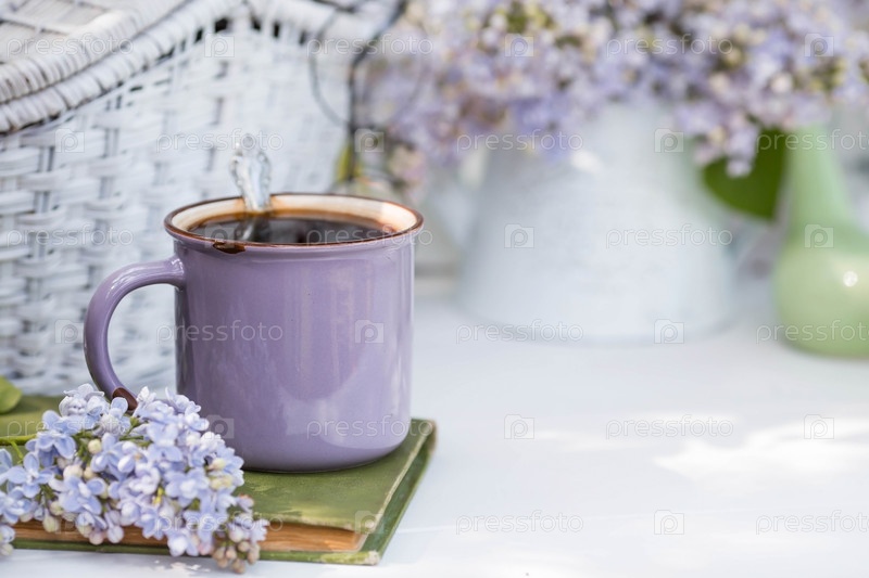 Открытка очень красивая. Причудливая фиолетовая кофейная кружка, старая книга и букет фиолетового сирени. Прекрасная натюрморт. Весеннее время. Концепция «Доброе утро»