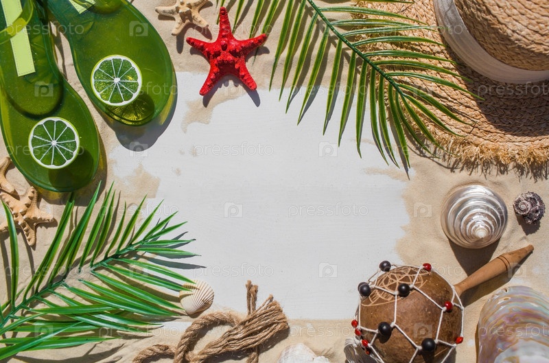 Концепция отдыха на море. Ракушки, звезды, соломенная шляпа, бикини, солнцезащитные очки, лаймовые шлепанцы и маракасы на песке. Предыстория летних каникул с пространством для текста. Вид сверху