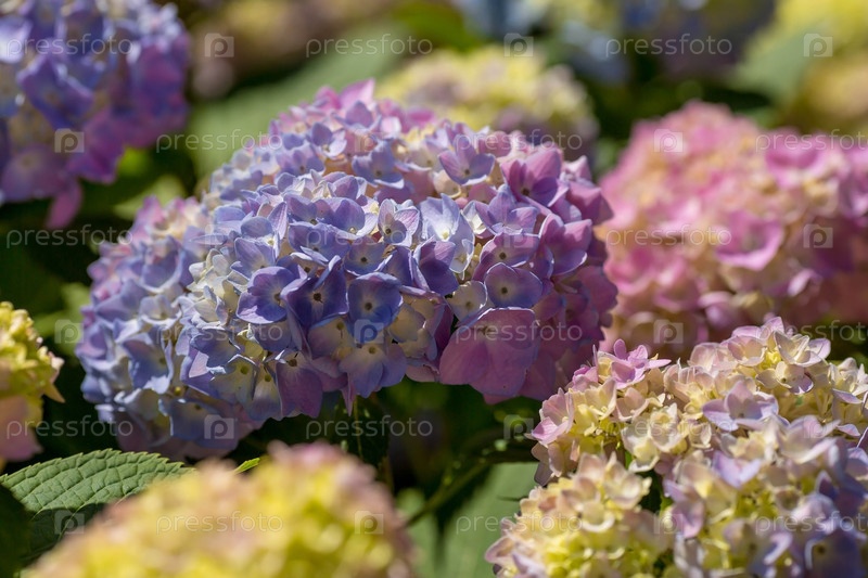 Летнее фото или фон с разноцветными цветами. Красивая природа с цветущим деревом. Красивые здоровые гортензии, цветущие в синих, розовых и фиолетовых оттенках