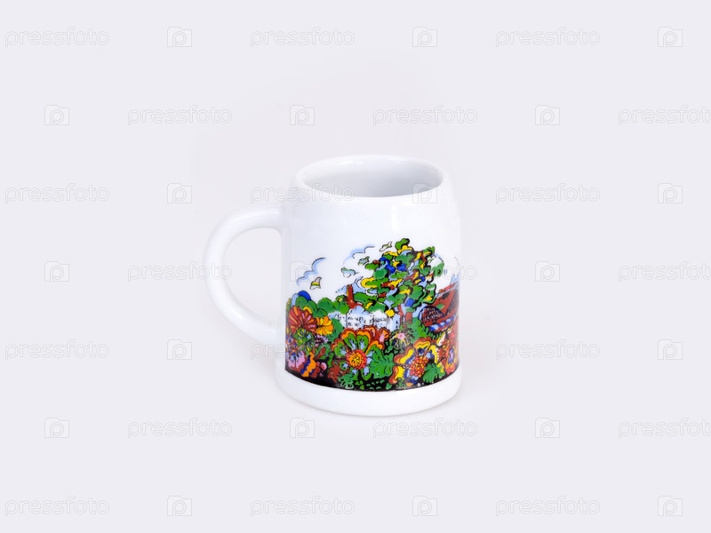 Белая глиняная кружка с рисунком, изолированным на белом фоне