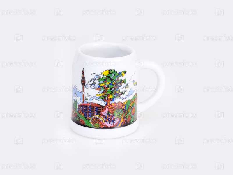 Белая глиняная кружка с рисунком, изолированным на белом фоне