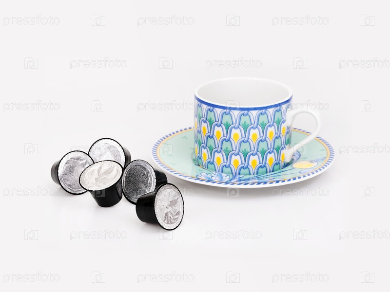 Кофейная чашка с средиземноморским орнаментом и кофейные капсулы выделены на белом фоне