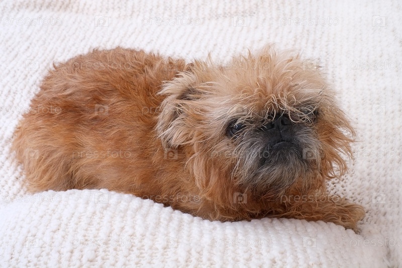 Маленький брюссельский грифон на белом диване у дома