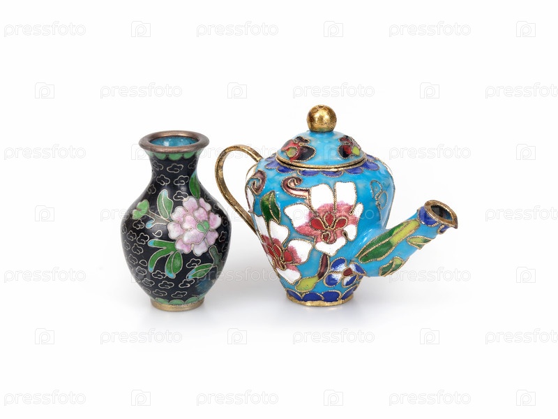 Традиционный китайский металлический чайник и ваза украшены разноцветной эмалью (клоизонном), изолированной на белом фоне