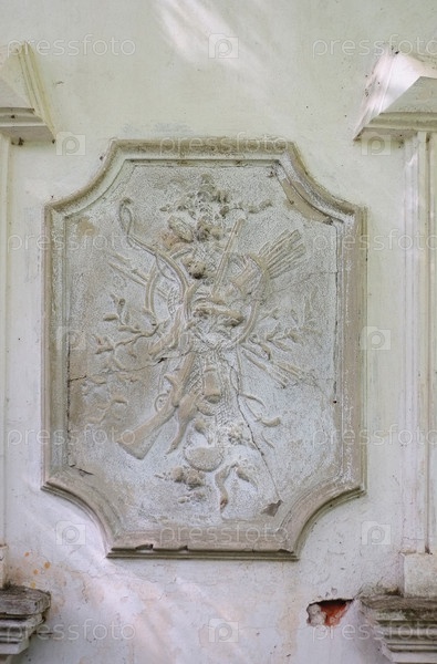 Изолированный барельеф с охотничьим сюжетом на стене старой усадьбы